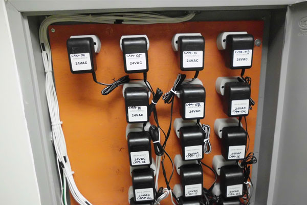 Para cada ponto de câmera é necessário um cabo coaxial para vídeo, que vai até o servidor; um cabo exclusivo para alimentação da câmera, que deve partir de uma caixa com tamanho suficiente para instalação das fontes e cabo para iluminação dedicada, a partir de um quadro elétrico com comando por sensor de presença.